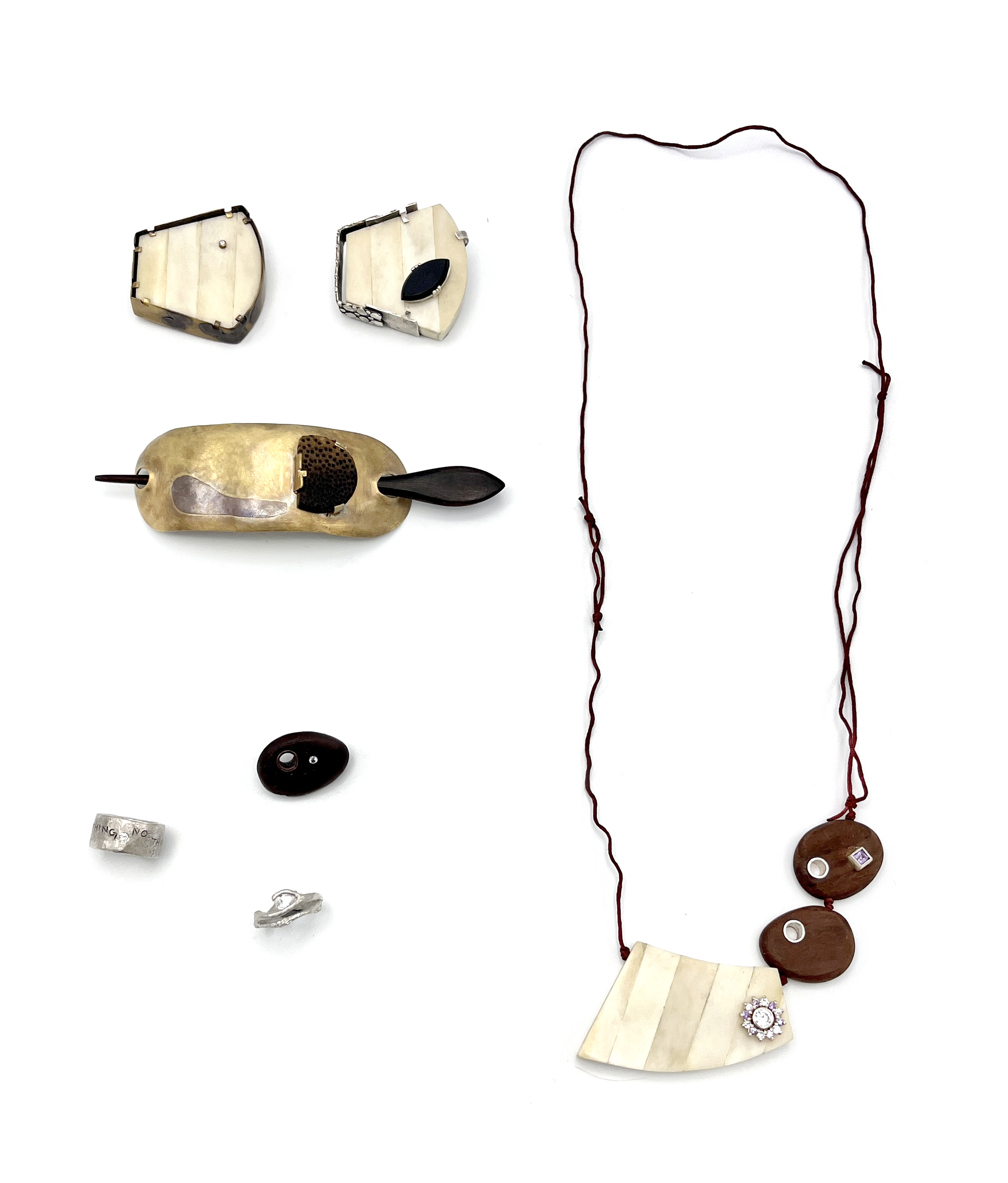 THESE ADORNMENTS WERE MADE AS A PART OF THE COMMUNITY FOR ETHICAL JEWELRY’S RADICAL JEWELRY MAKEOVER PROJECT. USING MATERIALS SOURCED FROM THE COMMUNITY, THE PROJECT ASKS WHAT SUSTAINABILITY LOOKS LIKE IN A FIELD BUILT ON PRECIOUSNESS AND EXTRACTION.